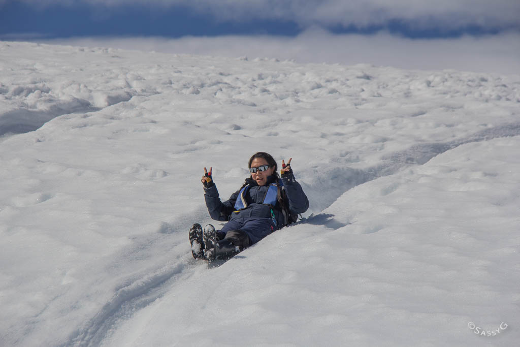 After marveling at the view for some time we started back down. Under guidance to prevent disappearing down any hidden crevasses some passengers decided to take the easy way down and slid.